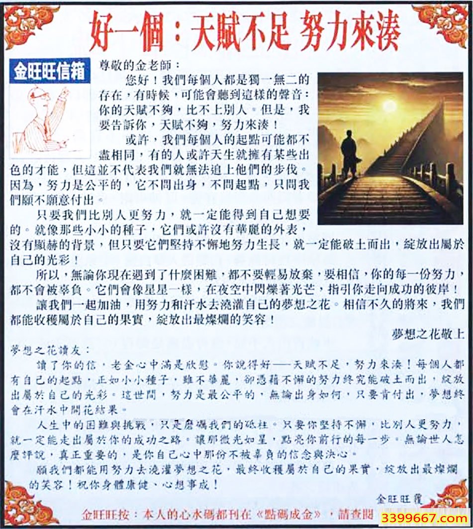 084期:金旺旺信箱彩民推荐→→《好一個:天賦不足 努力來湊》