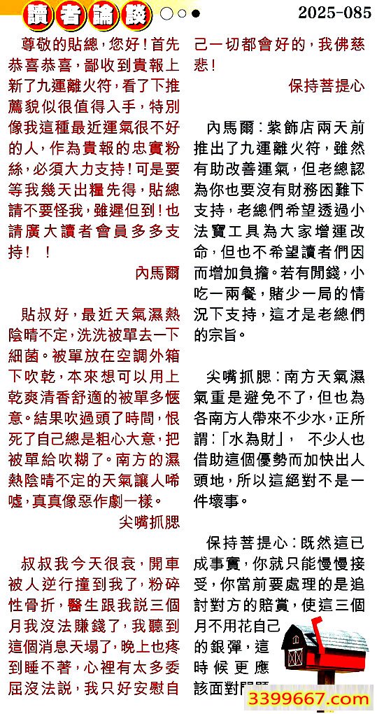 | 主题 :085期:彩民推荐〖貼信讀者論壇〗 |