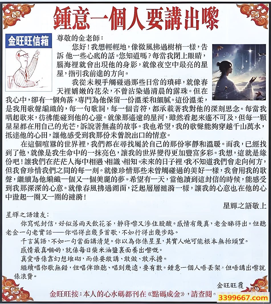 087期:金旺旺信箱彩民推荐→→《鐘意一個人要講出嚟》
