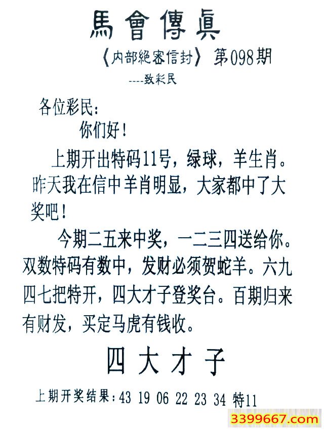 主题 :098期:首发推荐:≮馬會傳眞≯→(香港正版)