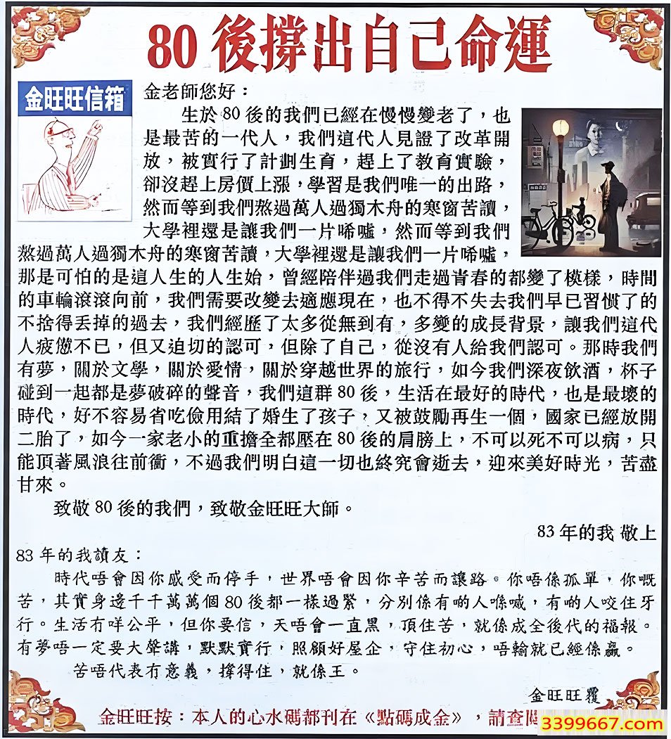 | 主题 :122期:金旺旺信箱彩民推荐→→《80 後撐起自己命運》 |