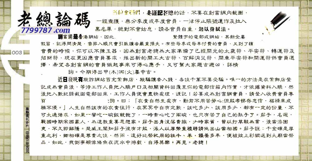 | 主题 :003期:六合皇金句/老总论码/萧公子/林大师/五行夺码/老总信箱截 |