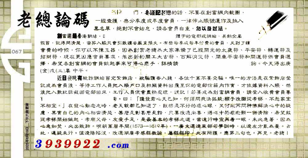 | 主题 :067期:六合皇金句/老总论码/萧公子/林大师/五行夺码/老总信箱截 |