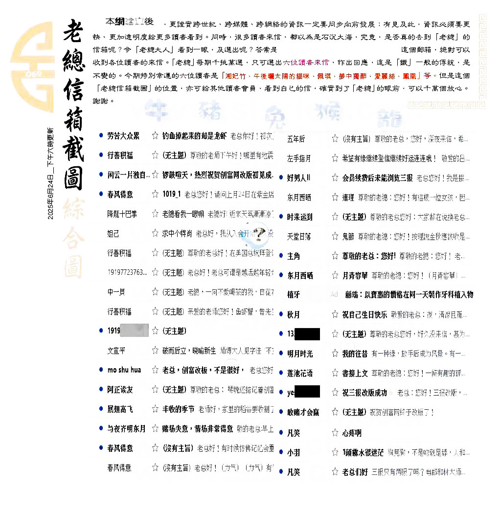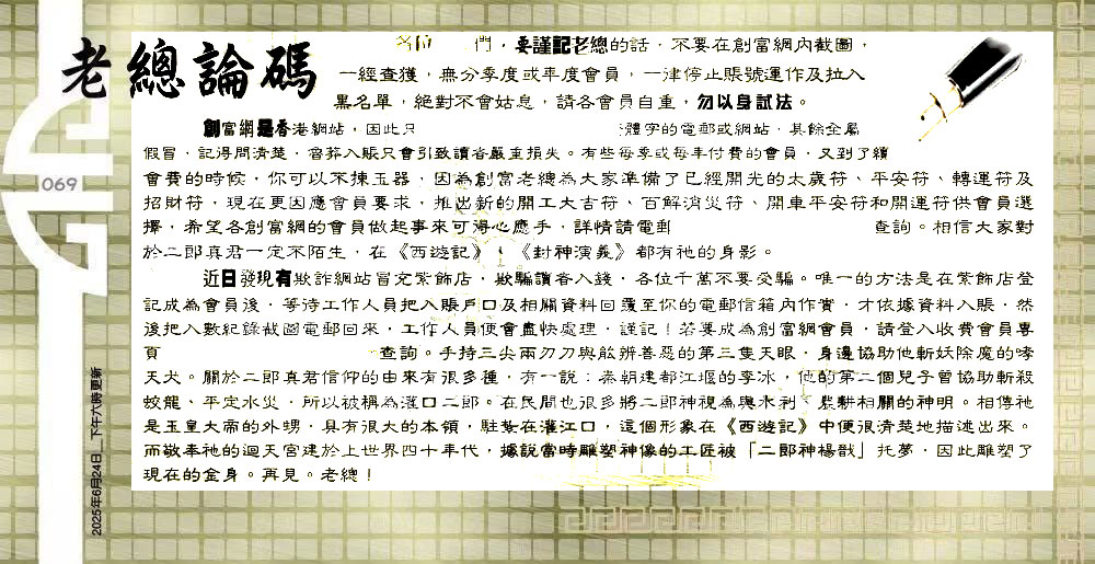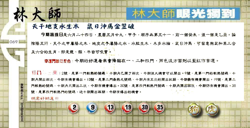 | 主题 :069期:六合皇金句/老总论码/萧公子/林大师/五行夺码/老总信箱截 |
