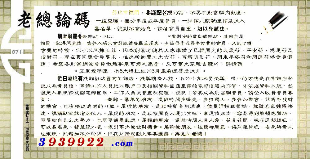 | 主题 :071期:六合皇金句/老总论码/萧公子/林大师/五行夺码/老总信箱截 |