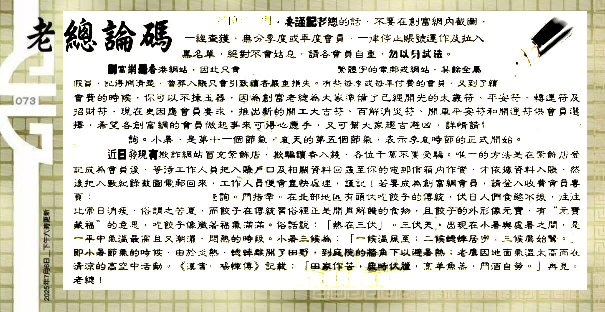 | 主题 :073期:六合皇金句/老总论码/萧公子/林大师/五行夺码/老总信箱截 |