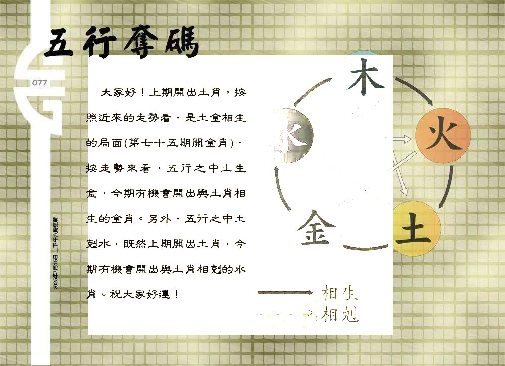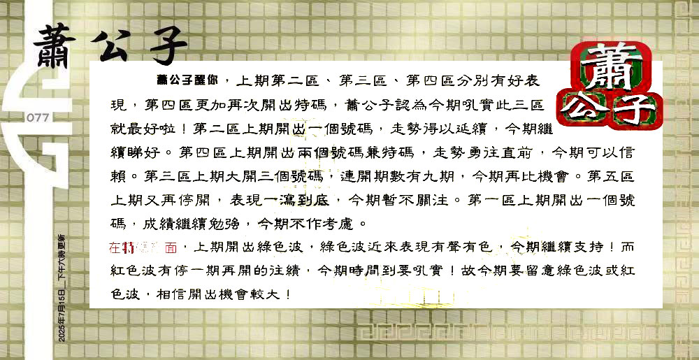 | 主题 :077期:六合皇金句/老总论码/萧公子/林大师/五行夺码/老总信箱截 |