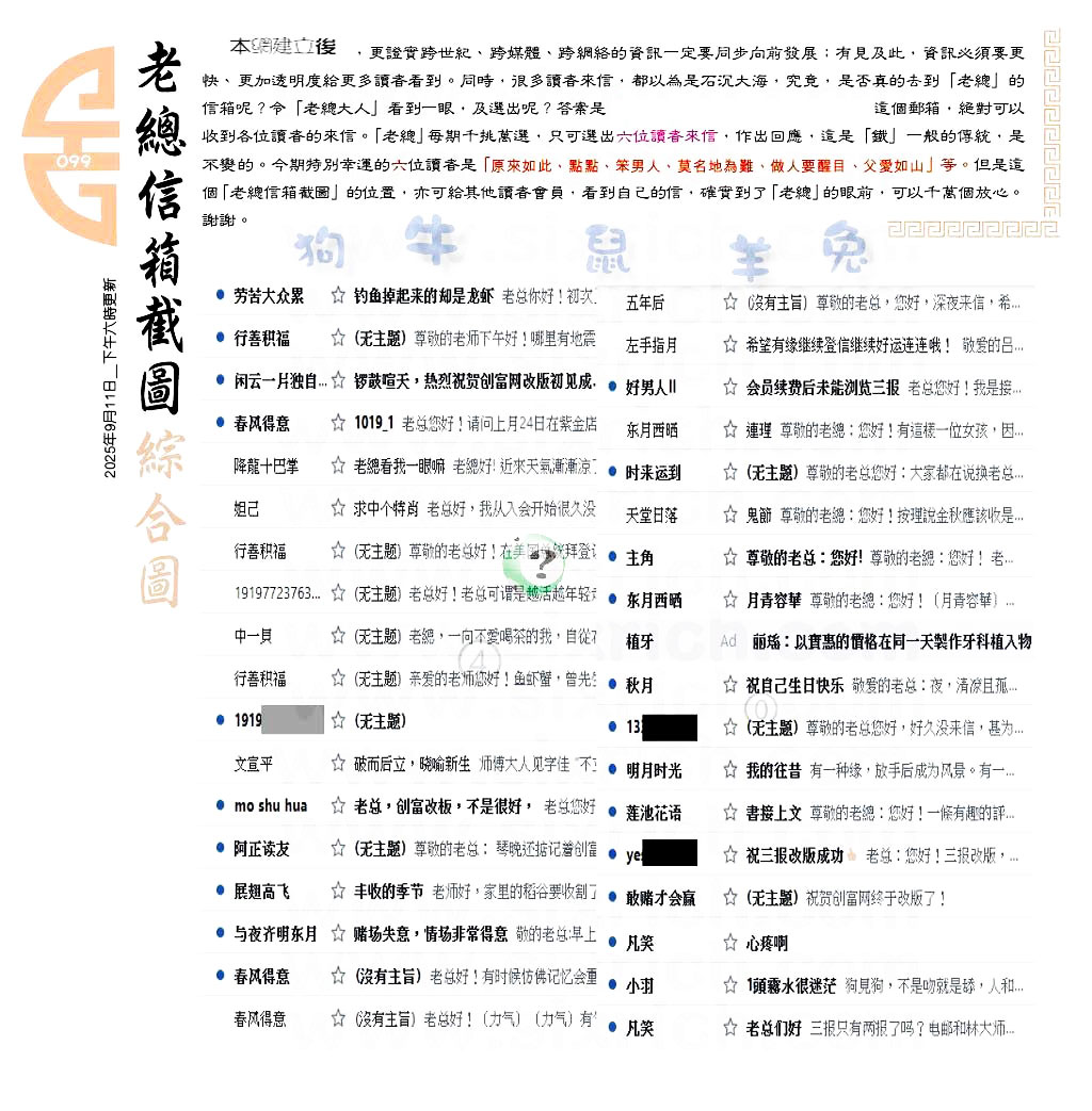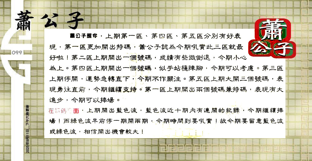 | 主题 :099期:六合皇金句/老总论码/萧公子/林大师/五行夺码/老总信箱截 |