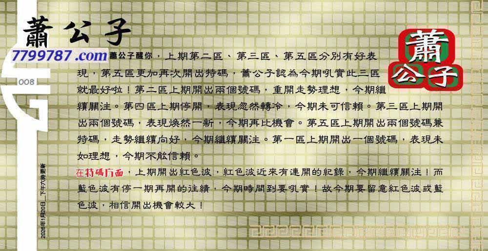 | 主题 :008期:六合皇金句/老总论码/萧公子/林大师/五行夺码/老总信箱截 |