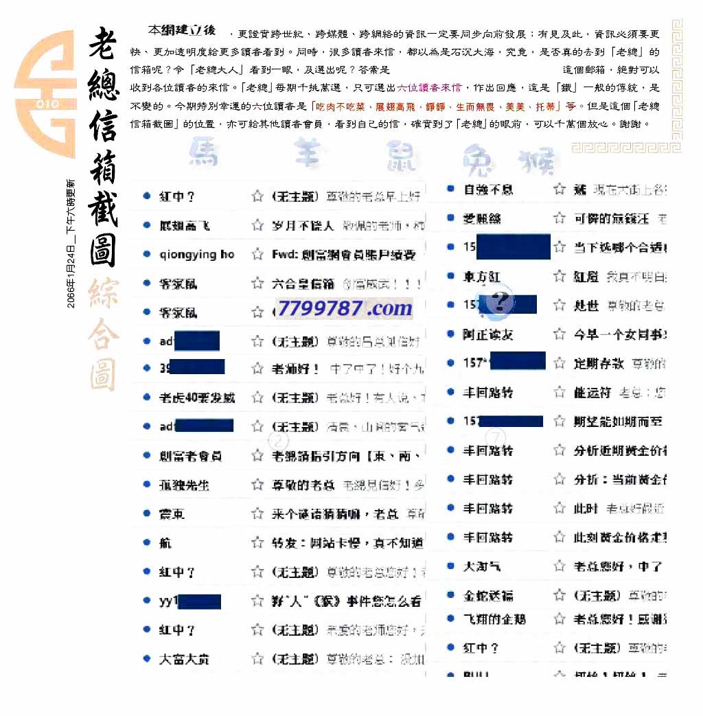 | 主题 :010期:六合皇金句/老总论码/萧公子/林大师/五行夺码/老总信箱截 |